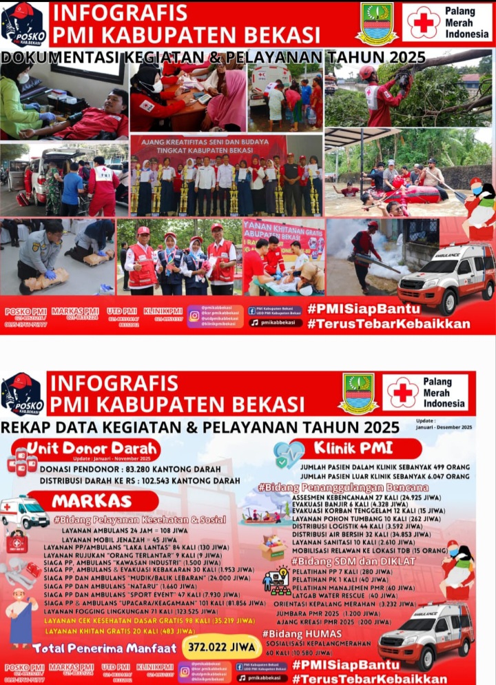 Kabupaten Bekasi, 2 Januari 2026 – Palang Merah Indonesia (PMI) Kabupaten Bekasi merilis laporan kegiatan yang telah dilaksanakan sepanjang tahun 2025, terhitung sejak Januari hingga Desember 2025.