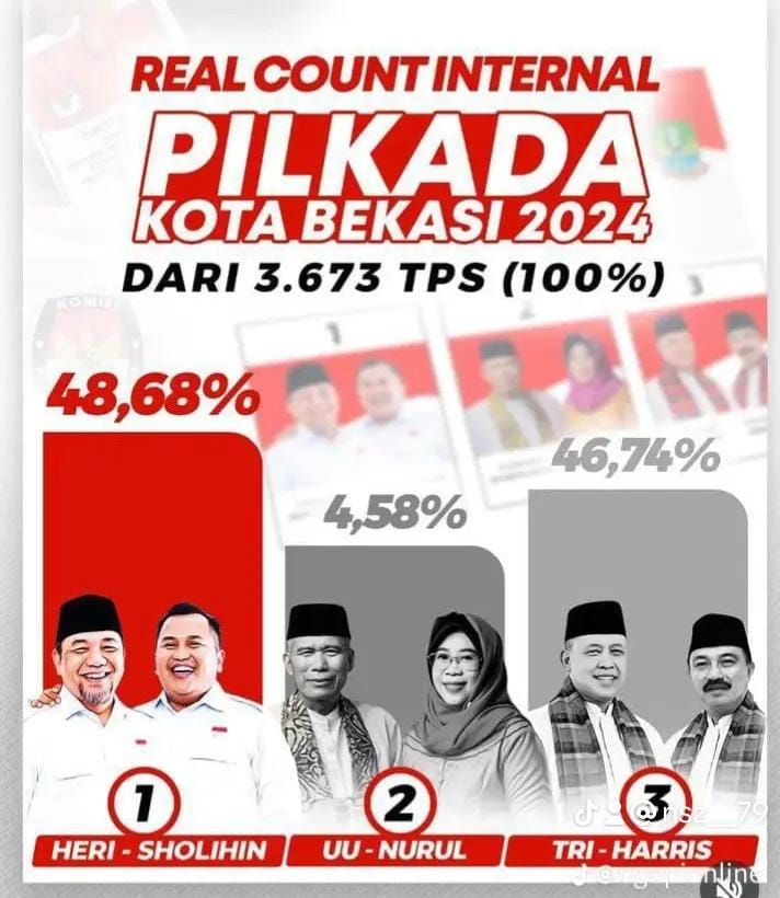 Tim Pemenangan pasangan calon (Paslon) Wali Kota dan Wakil Wali Kota Bekasi Heri Koswara dan Sholihin mengklaim telah memenangi kontestasi pemilihan kepala daerah (Pilkada) Kota Bekasi pada 27 November 2024.